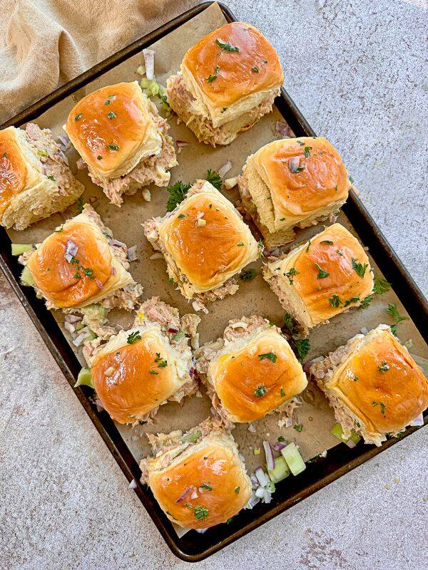 One hundred mini meatloaf sandwiches mixed with chicken, ham, turkey, and beef. With others like peppers, onions, mushrooms with breadcrumbs and ketchup with bbq sauce. Lettuce, tomatoes, onions, pickles.